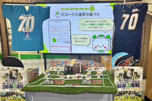 ▲駅員の皆さんが心を込めて作ってくださいました。試合用ヘルメットやボールも間近でご覧いただけます |