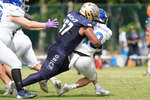 IBMは、開幕戦こそ東京ガスに敗れましたが、第2節ではオール三菱を45-14で圧倒し、勢いに乗っています。注目はQB#2政本選手。開幕戦では限定的な出場にとどまりましたが、第2節ではパス35回中25回成功、成功率70%超えという圧巻のパフォーマンスを披露。ホットラインとなるWR#84近江選手、新加入の193cm大型TE#5オーガー・トミー選手に、それぞれ2本ずつTDパスを通しており、強力なパス攻撃には最大限の警戒が必要です。