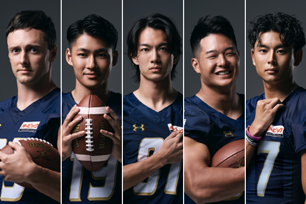 | ▲企画参加選手。左から、TE#85ホールデン選手、DB#19助川選手、WR#81佐久間選手、DL#90丸山選手、WR#17大谷選手 |