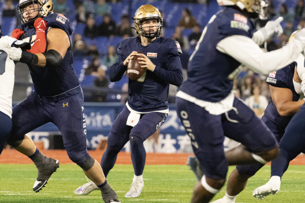 | ▲QB#3ピアース、36回のパスで26回成功。335ヤード・3TDを稼ぎ、勝利に貢献 |