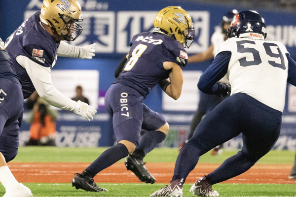 佐久間 優毅最初のシリーズで相手が得点した後のキックオフで、スピードを生かした79ヤードのロングリターンを披露。一気に敵陣13ヤードまで進み、チームを勢いづけるとともに、同点TDのお膳立てをした。