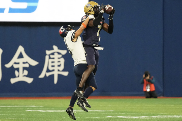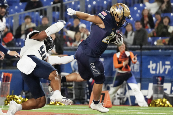 佐久間 優毅残り1分19秒、46ヤードの逆転TDレシーブを見事に決めた。この攻撃シリーズで、15ヤードのランアフターキャッチでサイドライン出て時計を止めたのも、逆転劇につながった。