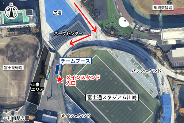 富士見公園のリニューアル工事に伴い、入場口が変更されました。メインスタンドへは、メインスタンド側芝生席入口からご入場ください。チームブースはその付近に設置します。また、スタジアム周辺の一部エリアでは、工事のため通行が制限されます。ご了承ください。