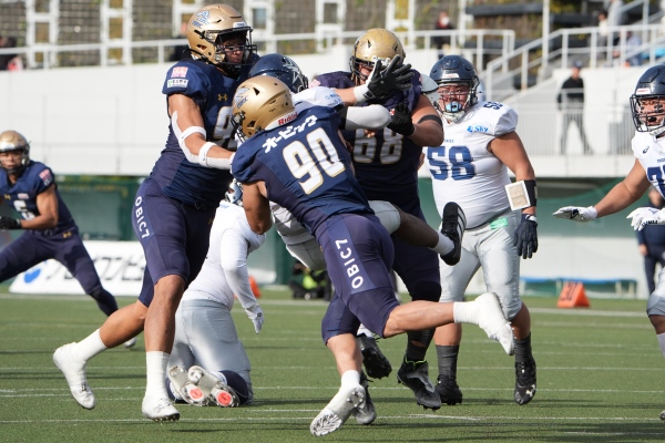 清家拓也インサイドで相手OLを押し上げるプレーが素晴らしく、2ハリー(QBにプレッシャーをかけてパスやプレー判断を急がせる)。そのプレッシャーがアウトサイドDLのラッシュも助け、ライン戦をけん引した。