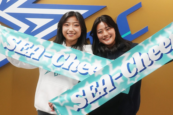 | SEA-Cheerによるダンスパフォーマンスをお楽しみください。ショーの終盤には、バズーカーを使ってスタンドへSEA-Cheerオリジナルタオルやチームグッズをプレゼントします。 |