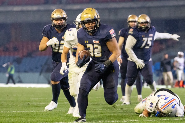 東京ガスは、新人QB#4谷口選手が試合を重ねるごとにフィットし、#28ジャスティン・ホッブス選手らWR陣とのパス精度も向上。さらにRB#30星野選手、#32森分選手のランも絡めた多彩な攻撃には警戒が必要です。