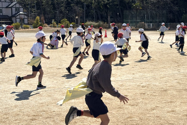 | ▲1・2年生全員でのしっぽ取りゲーム。最初のチャンピオンは1年生。「前を走る人のフラッグを狙いました」と作戦を話してくれました |