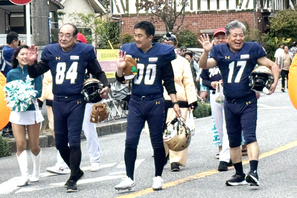 ▲昨年から始まったイベント「コスプレウォーク」。選手に扮しているのは、左から飯生喜正習志野市議会副議長、宮本泰介習志野市長、芦澤直太郎習志野商工会議所会頭。「選手かと思った」「チームのOBだったんですか?」など注目を集めていました |