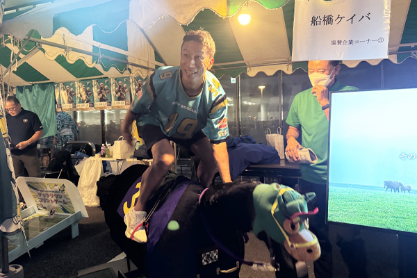 ▲船橋ケイバのブースでは、TDK(タッチダウン金子)が競馬の騎手(ジョッキー)を体験。この装置は、実際に騎手がトレーニングで使用する物だそうです |