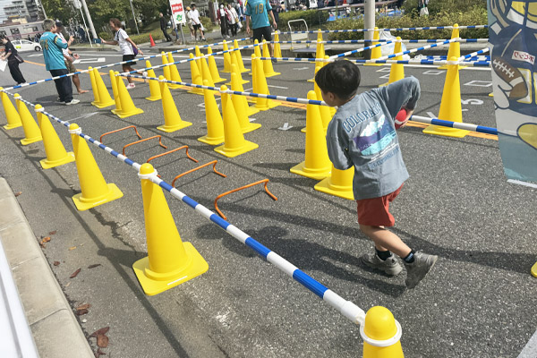 ▲「オービックシーガルズと遊ぼう」コーナー。ボールを持って、障害物を飛び越えたりくぐったりしながらタッチダウンに挑戦 |