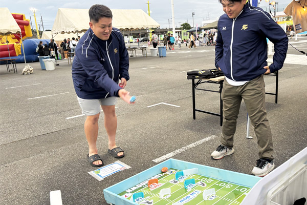 | ▲OL#51村田選手(左)が練習後に立ち寄り、アメフトのミニボールを転がすゲームに挑戦。「もう一回やりたくなりますね」と笑顔で話していました |