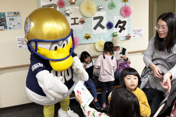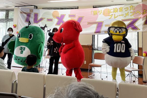 施設内は、地元のさまざまな団体が用意した屋台やゲームコーナー、ステージイベントなどでにぎわい、幅広い世代の皆さんが訪れていました。しーがるくんはオープニングセレモニーに参加した後、会場内で皆さんと記念写真を撮ったり、一緒にゲームで遊んだりと、交流を楽しみました。