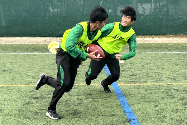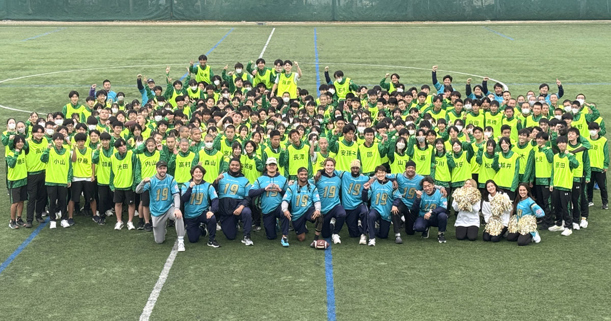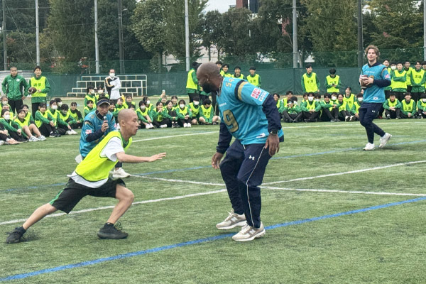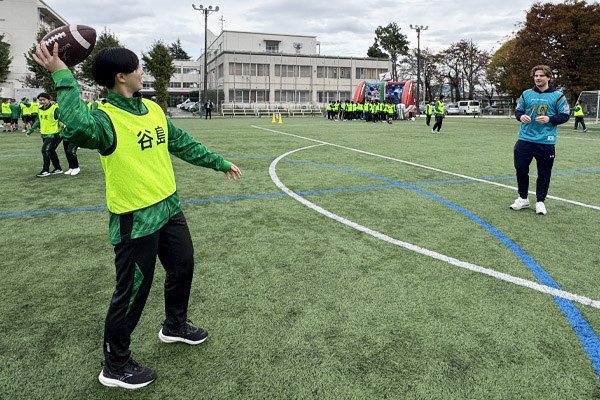 50分という限られた時間でしたが、意欲的に参加してくれる生徒が多く、「もっとやってみたい」と楽しそうに話してくれる姿が印象的でした。将来アメフトを始めるきっかけになれば、これほどうれしいことはありません。