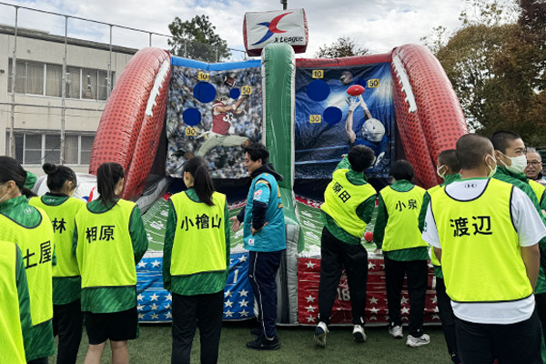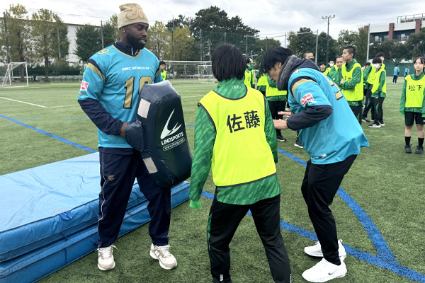 今回の体験会は、そうしたつながりのある習志野高校の皆さんに、アメフトの面白さを実際に体感してもらおうと初めて企画したものです。この日は、選手8名に加え、コーチ、チア、スタッフ含む計31名が参加。10の体験コーナーを設け、タックルやボールの投げ方、蹴り方などを指導・サポートしました。