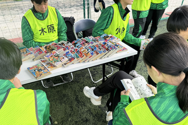 ▲アメフトを題材にした人気漫画「アイシールド21」を黙々と読む生徒たち