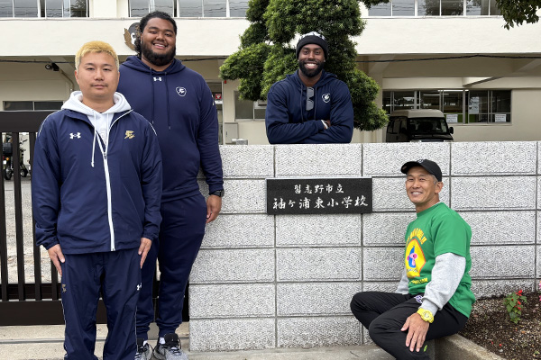 ▲【今日のアメフト先生】左からチームスタッフ山本勝也、OL#75デクスター・カー・ジュニア選手、DB#7ジェイソン・スミス選手、渡辺雄一さん(一般社団法人オービックシーガルズ習志野スポーツクラブ/チームOB)