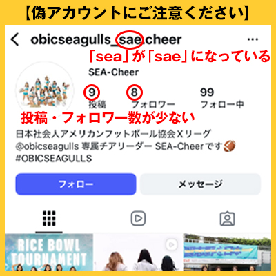 【注意喚起】SNSのなりすましアカウントにご注意ください2025年11月27日 現在、SEA-Cheer公式Instagramを装ったなりすましアカウントが確認されています。 正:obicseagulls_sea.cheer 偽:obicseagulls_sae.cheer(「sea」が「sae」になっている) 当チームとは一切関係がないアカウントです。フォロワー数や投稿が極端に少ないという特徴があります。上記のアカウントからフォローやDMが届いた場合は、開封・返信・個人情報の提供を行わず、通報をお願いいたします。 シェア: