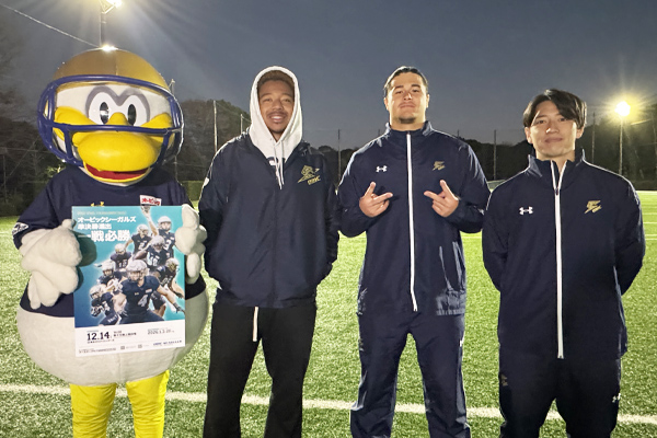 | ▲12/4(木)の放送回には4名が出演。左から、しーがるくん、WR#18渡邊選手、DL#99トゥロター選手、K/P#12山﨑選手 |