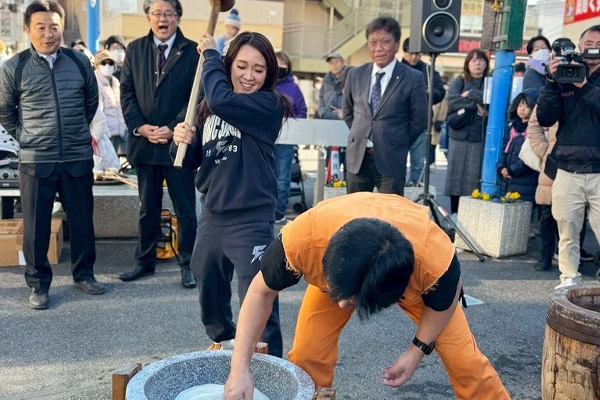 | ▲餅つきに参加するYUI。使用されたもち米は、習志野の自然を守る「NORAの会」の皆さんが育てた習志野産のもの。できたお餅は、来場者にお雑煮にして振る舞われました |