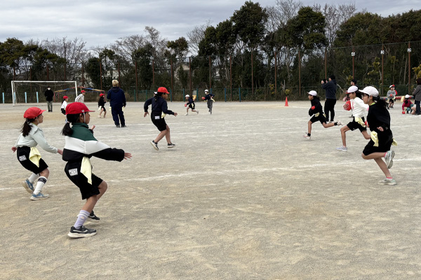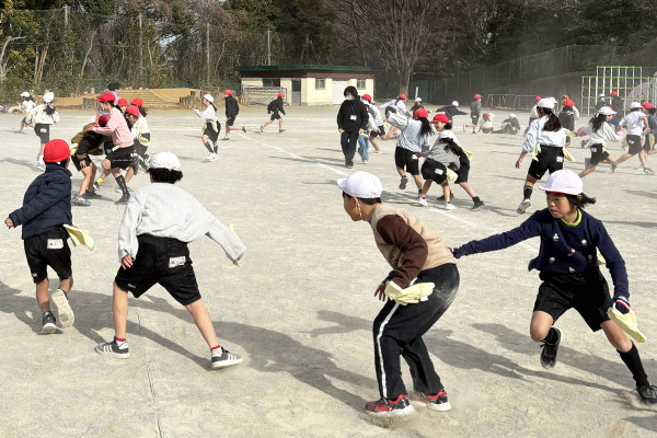 ▲しっぽ取りゲームでは、止まる指示にもすぐに止まれないほど、児童たちが校庭いっぱいを使って全力で走っていました
