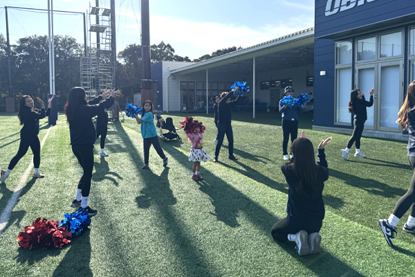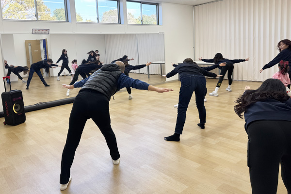 | ▲体が温まったら、グラウンドでダンス練習。「天気も良いし、開放感があっていいですね」 |