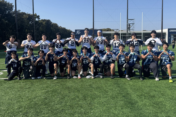 | ▲最後左から、DB#41アンダーソン選手、宮崎LBコーチ、LB#44成瀬選手、TE#80蓑崎選手、WR#83山中選手、TE#85ホールデン選手、WR#18渡邊選手、DL#99トゥロター選手、WR溝口選手(2026年加入予定)、TE#92野宮選手 |