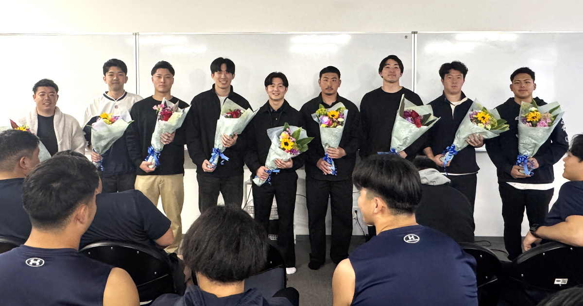 | ▲3/20(金祝)の2026シーズン キックオフミーティングで引退者セレモニーを行いました。左からQB#15小林優之選手、黒木俊輔キッキングアシスタントコーチ、DB#23山内健士郎選手、LB#20張 湧実選手、DB#27石川 慧選手、TE#89植原 涼選手、WR#82成田将吾選手、DB#31杉本紘一選手、QB#14勝見朋征選手 |