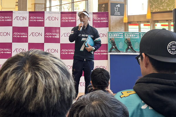 グランドオープン直後の週末ということもあり、館内はたくさんの来場者でにぎわい、ステージイベントにも多数の方にお立ち寄りいただきました。中にはチームグッズを身につけて来てくれた方もいて、「ゴールデンウィークの予定は開幕戦だけです。絶対に勝ってください」といった激励の言葉もいただきました。